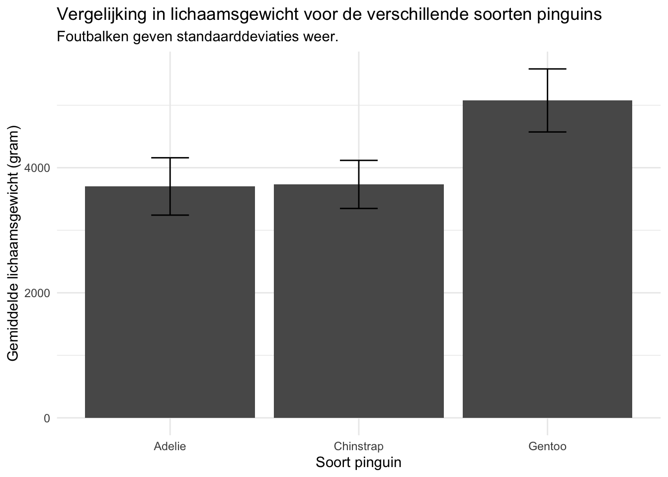We gaan verder met de pinguin dataset. We vragen ons af of er een verschil is in het gemiddelde lichaamsgewicht tussen de drie soorten pinguins. In R kunnen we hiervoor een staafdiagram maken die het gemiddelde lichaamsgewicht voor elke pinguin weergeeft en waarin de standdaardeviaties zijn weergegeven als foutbalken: