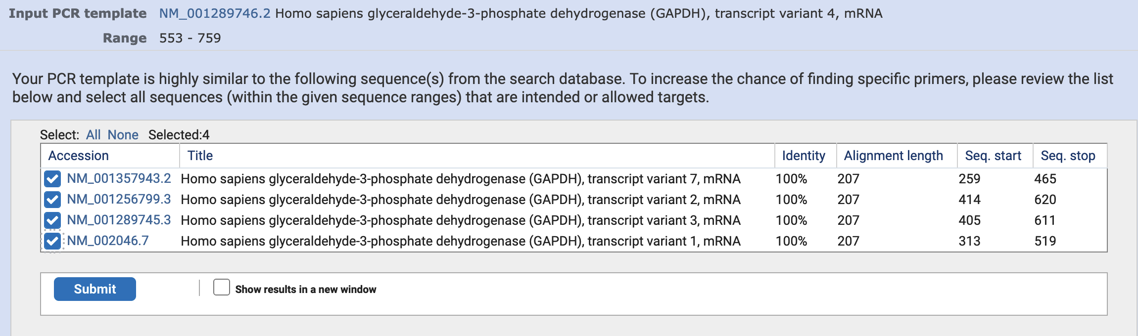 Tijdens het ontwerpen van de primers geeft Primer-BLAST aan dat er transcripten zijn die overeenkomen met ons transcript: