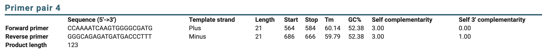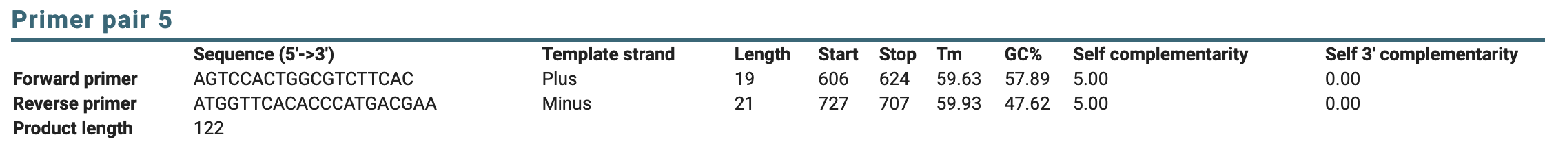De output van Primer-BLAST is een lijst met primerparen die gebruikt kunnen worden voor qPCR. De output bevat de volgende gegevens: