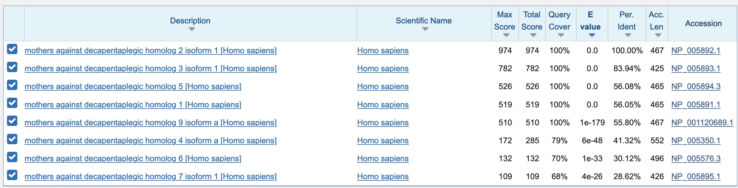 NB: de gevonden eiwitten worden automatisch gesorteerd op de E-score. Voor SMAD3 is de E-score het laagste en het percentage identieke aminozuren het hoogst. Het eerste eiwit is natuurlijk SMAD2 zelf!