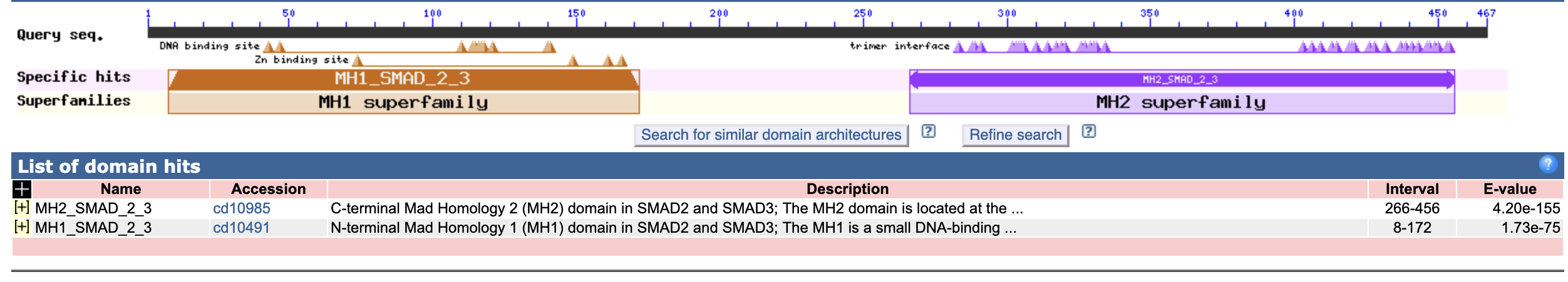 MH1_SMAD_2_3domein, dat loopt van aminozuur 8 t/m 172. - Het