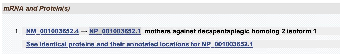Bepaal voor het eerder gevonden SMAD2 eiwit: