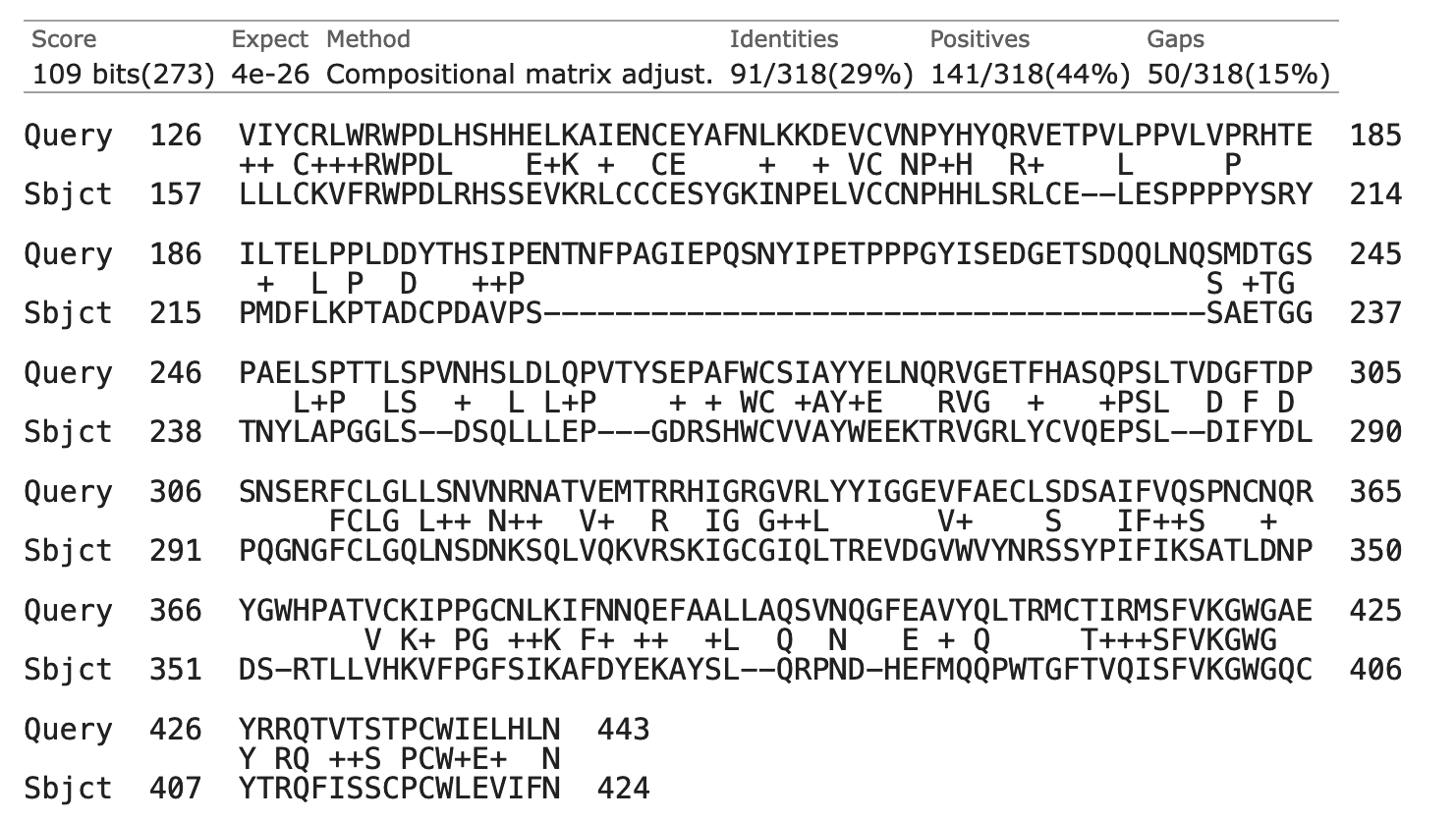 - Percent identity: hoeveel procent van de aminozuren in de overlappende regio zijn hetzelfde? Voor ons eiwit en het gevonden eiwit is een alignment uitgevoerd. Voor de regio die aanwezig is in de alignment (de overlap tussen de twee eiwitten) wordt bepaalt hoeveel procent van de aminozuren hetzelfde zijn in de twee eiwitten (dus hoeveel procent matches er zijn in de alignment).