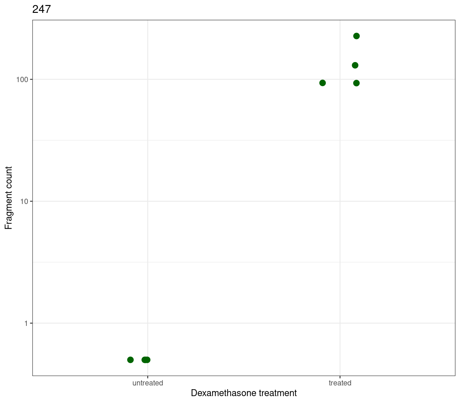 Een eenvoudige plot die veel gebruikt wordt is de Count plot. Deze grafiek kan bijvoorbeeld toegepast worden om het verschil in ruwe counts voor een gen te tonenen per conditie. Om te oefenen met de grafieken maken we gebruik van een andere dataset. Deze dataset is onderdeel van de R ‘airway’ package). Meer informatie over de data en het onderzoek kun je vinden in het artikel, Himes et al. (2014).