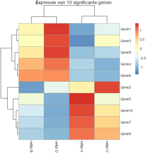 pheatmap(count_values, show_rownames = TRUE, main = "Expressie van de 10 meest significant genen")