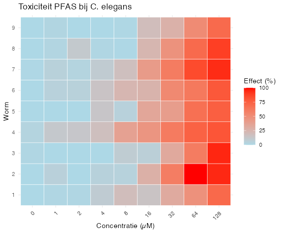 Een voorbeeld van een heatmap is hieronder gegeven waarbij de toename van de concentratie PFAS is uitgezet tegen het effect op de wormen.