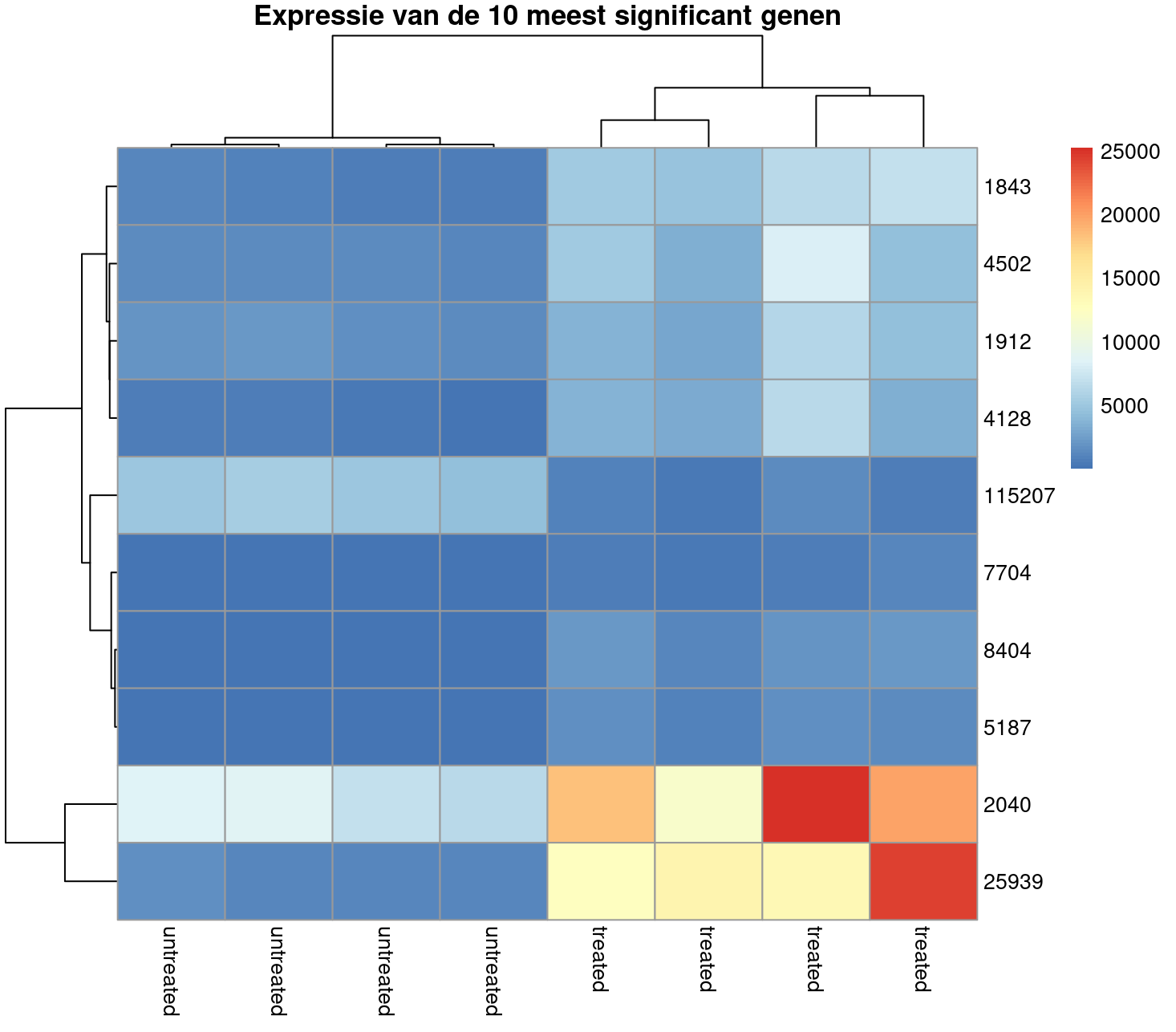 Met de onderstaande code kan een heatmap gemaakt worden waarbij we gebruiken maken van de airway dataset. We plotten de 10 meeste significante genen waarbij we gebruik maken van de absolute waarden die gemeten zijn.