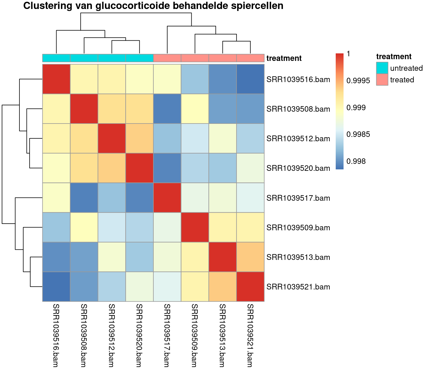 Bij RNA-seq analyses kan de heatmap toegepast worden om inzicht te krijgen in de correlaties en relatieve toename in genexpressie. Een belangrijke controle stap is bijvoorbeeld om te kijken hoeveel de monsters op elkaar lijken die je onderzoekt en hoe zij groeperen. Uiteindelijk is het voor de genexpressie analyse interessant om ook zicht te krijgen op de variatie van expressie bij de monsters en hoe ze groeperen. Hieronder is daar een voorbeeld van gegeven.