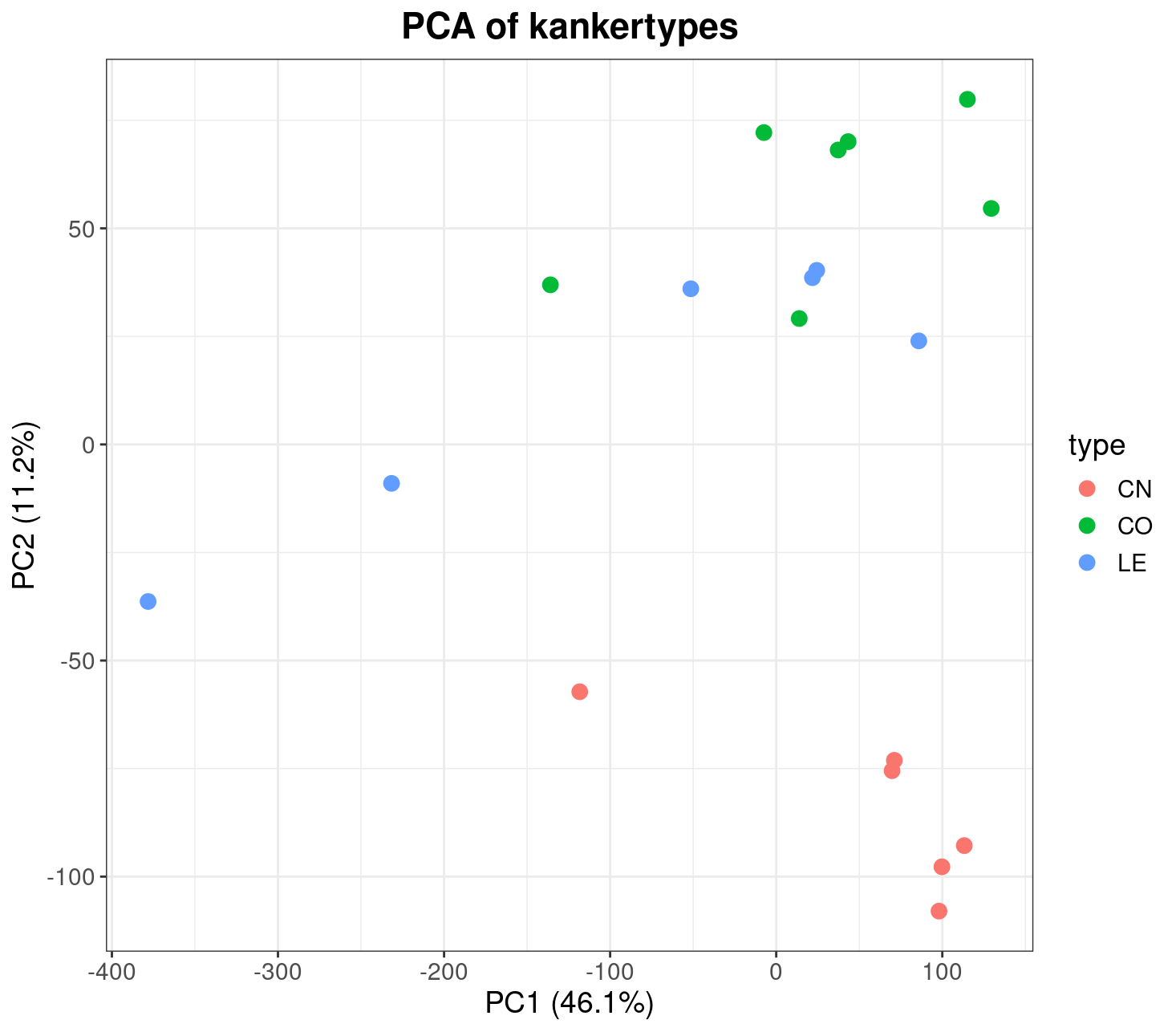 We gaan verder met het plotten van de resultaten van de PCA analyse om te kijken hoe de monsters verdeeld zijn. Om de kankertypes makkelijke te onderscheiden in de PCA plot koppelen we er één kleur aan, met behulp van de onderstaande code.