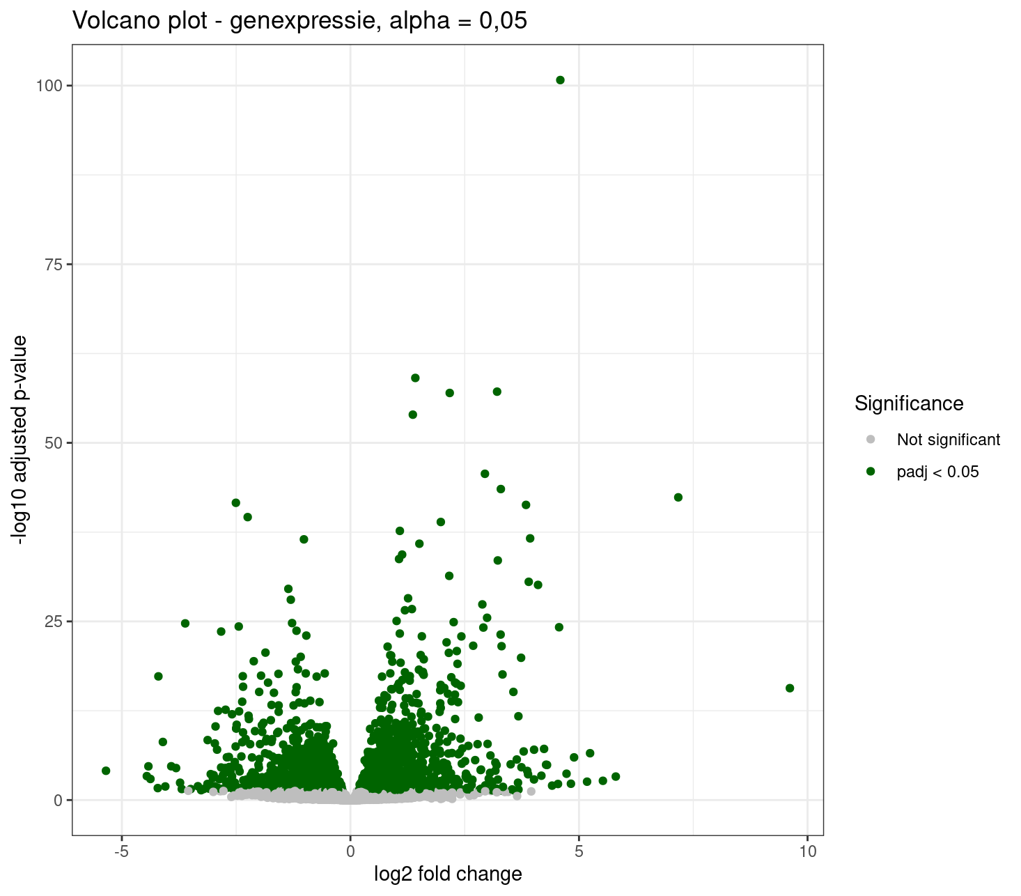ggtitle("Volcano plot - genexpressie, alpha = 0,05") +