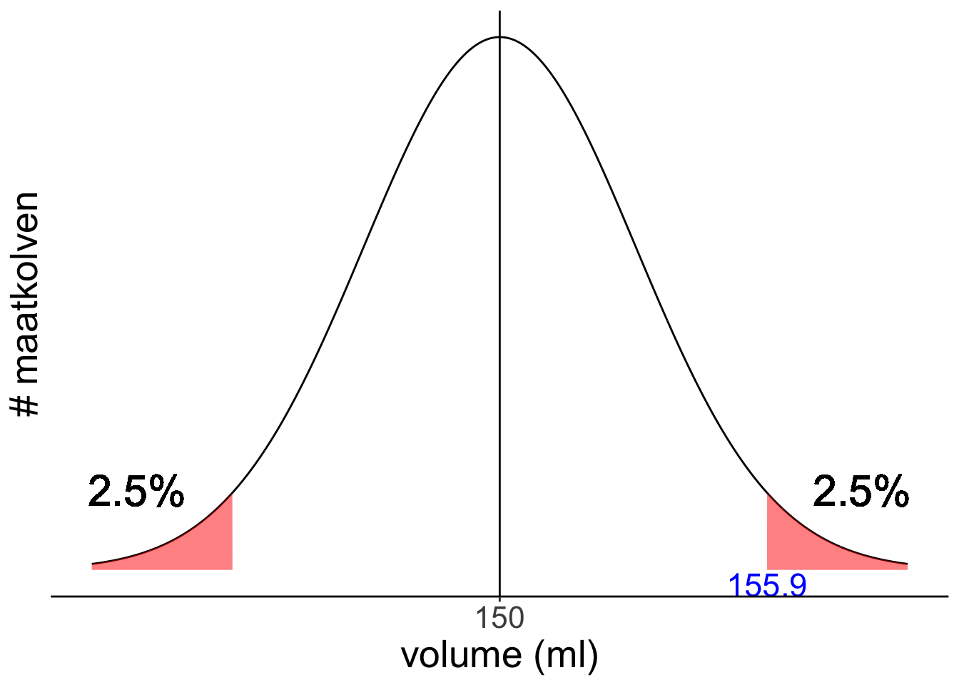 De afstand tot het gemiddelde die we zoeken is net zo groot, maar dan onder het gemiddeld in plaats van erboven: 155,9 - 150 = 5,9 ml.